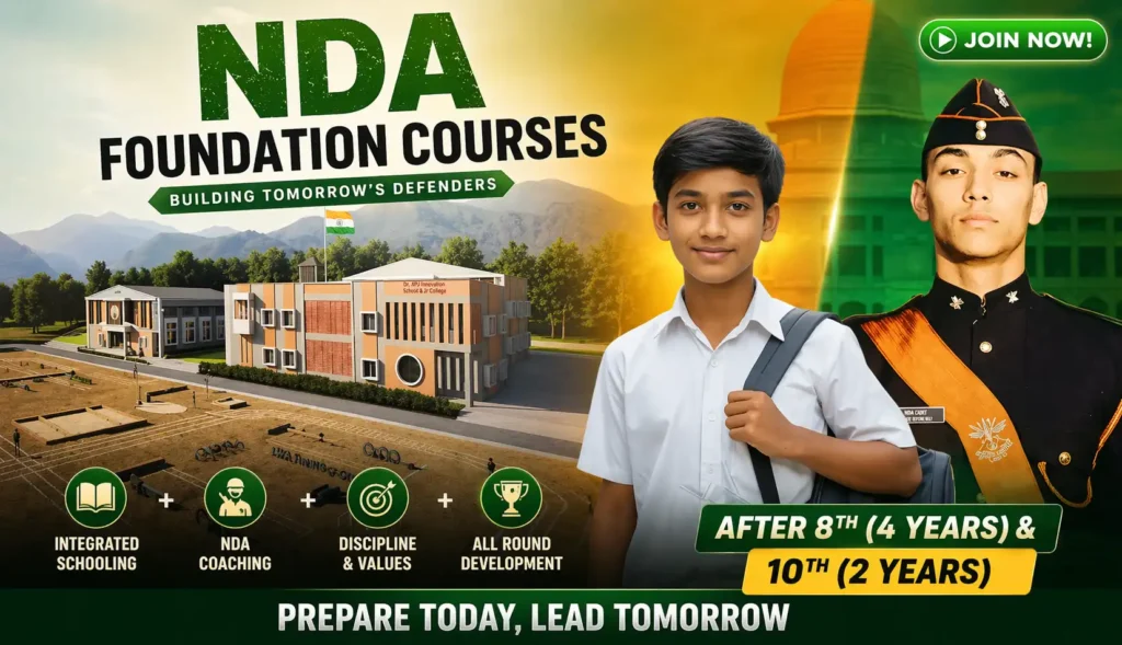 An NDA Foundation Program is an early-stage, integrated training course (usually 2-4 years) designed for school students (typically classes 8-12) to prepare for the National Defence Academy (NDA) written exam and SSB interview simultaneously with their school studies. It strengthens academics, physical fitness, and personality to build a strong base for a defence career.